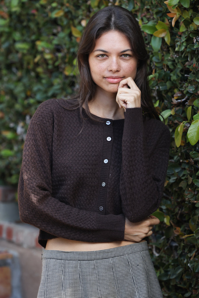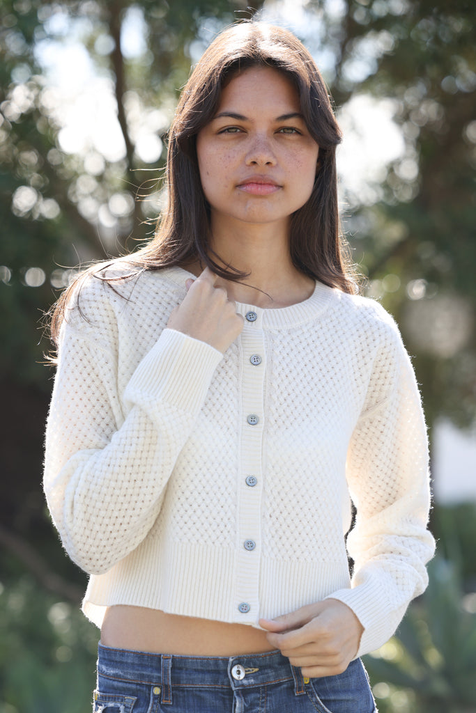 Women's long sleeve crewneck cardigan with button front, featuring an allover novelty stitch and a relaxed, comfortable fit.